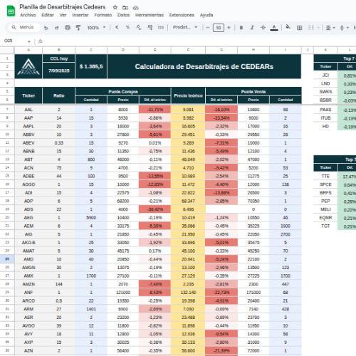 Detecta diferencias de precios entre activos equivalentes (por ejemplo, CEDEARs vs acciones en NY) y detectar si existen oportunidades de arbitrajes.
